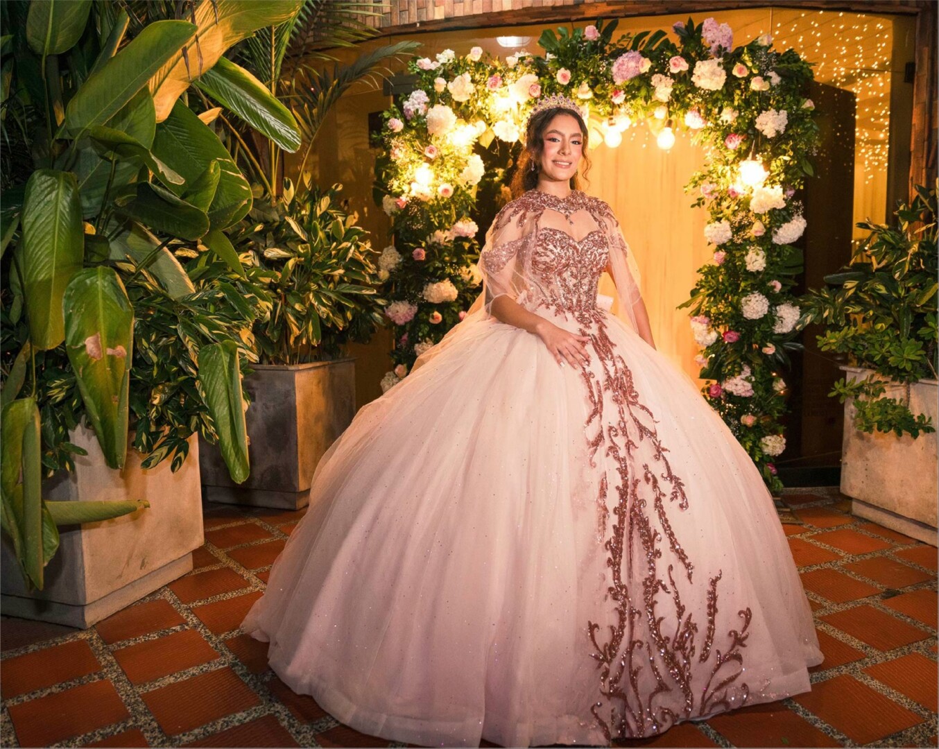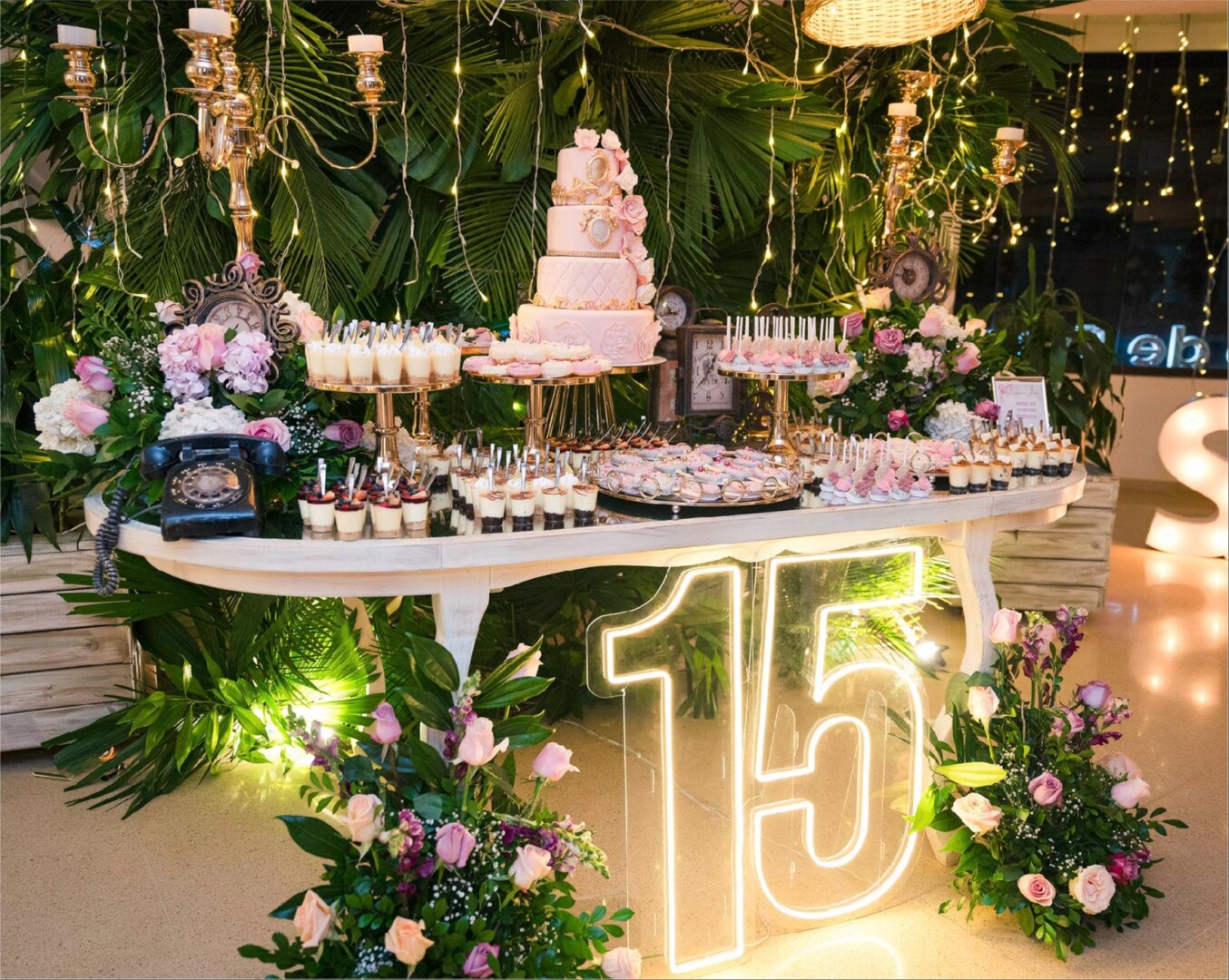 La quinceañera deslumbró con un vestido de ensueño, irradiando felicidad en un espacio diseñado para que cada momento fuera inolvidable. La mesa de postres, decorada con flores delicadas y luces sutiles, reflejaba la dulzura y elegancia de la ocasión.