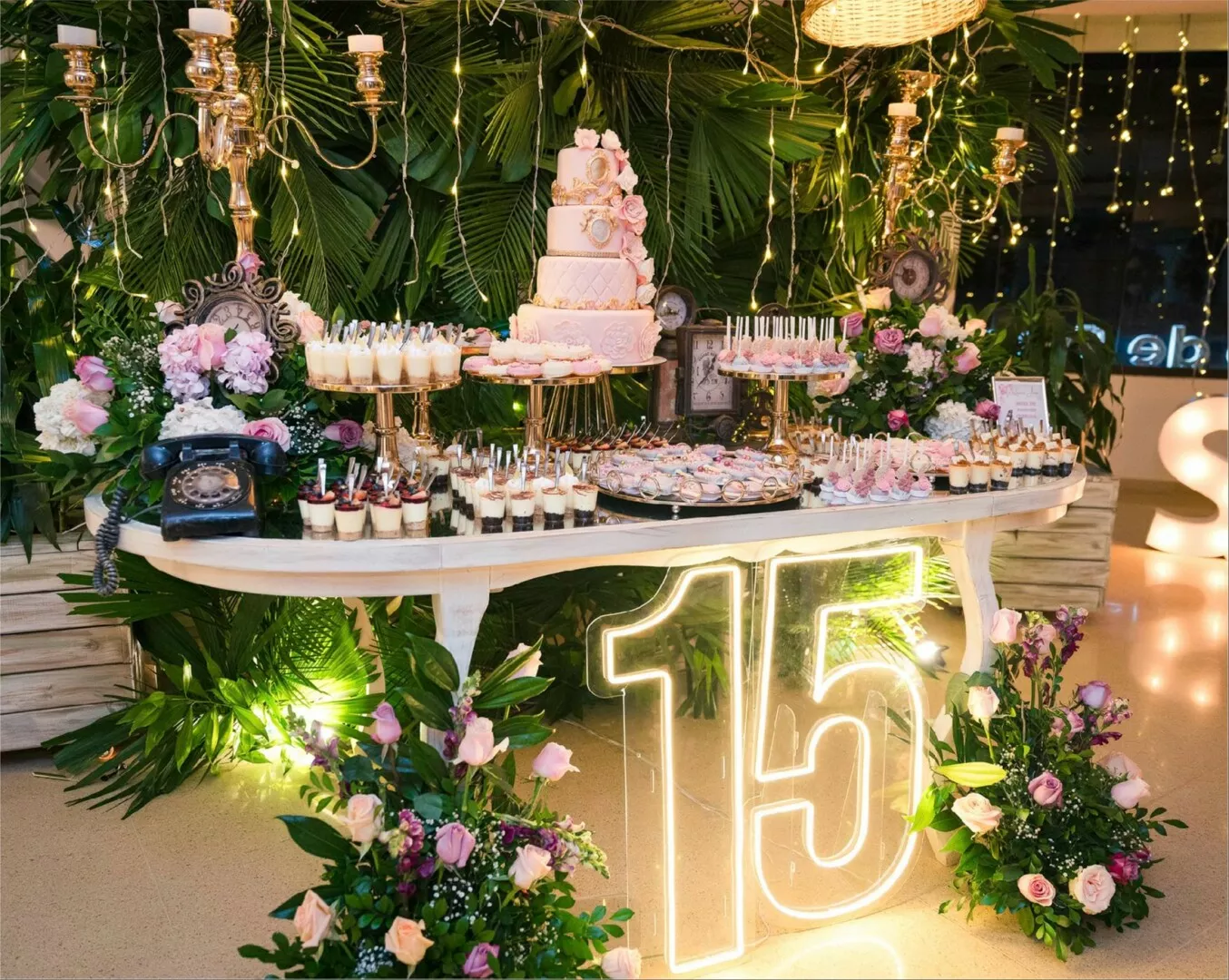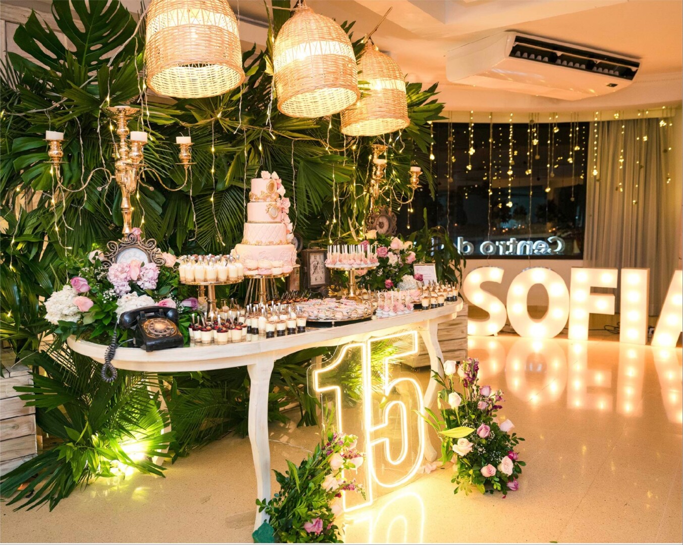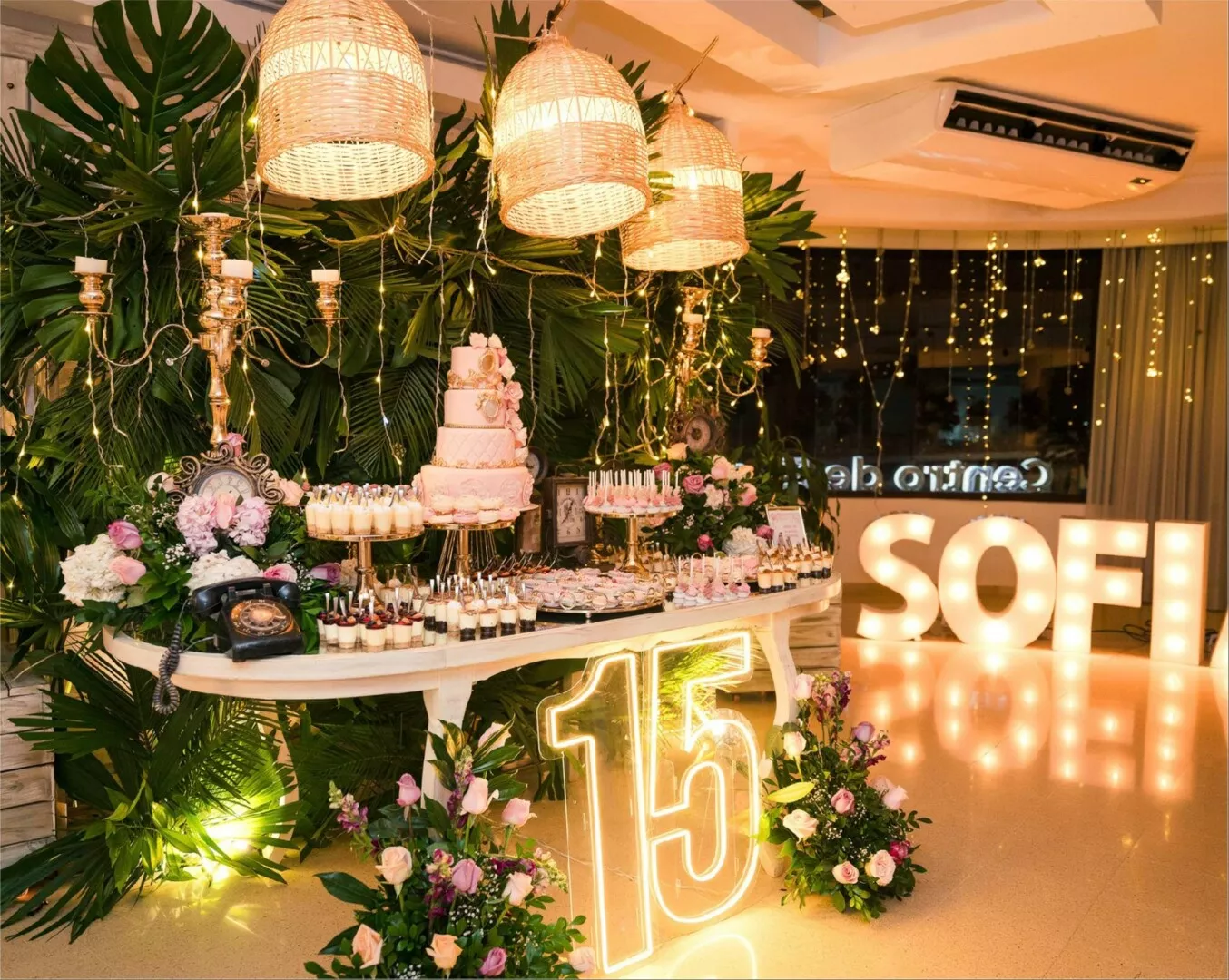 El Salón Vivaldi en Laureles se transformó en un escenario mágico donde cada detalle brilló con esplendor para celebrar los 15 años de Sofi. Bajo un techo de luces cálidas y rodeado de una decoración sofisticada con toques dorados y verdes exuberantes, esta noche se convirtió en un sueño hecho realidad.